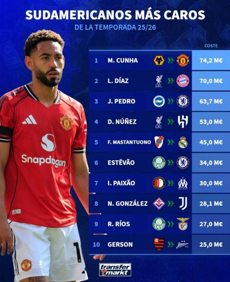 直播吧8月26日讯 转会市场盘点了今年夏窗截至目前南美球员转会费榜单,其中库尼亚居首,迪亚斯次席,具体榜单如下:1、库尼亚(狼队→曼联)7420万欧2、迪亚斯(利物浦→拜仁)7000万欧3、若昂-佩德罗(布莱顿→切尔西)6370万欧4、努涅斯(利物浦→利雅得新月)5300万欧5、马斯坦托诺(河床→皇马)4500万欧6、埃斯特旺(帕尔梅拉斯→切尔西)3400万...